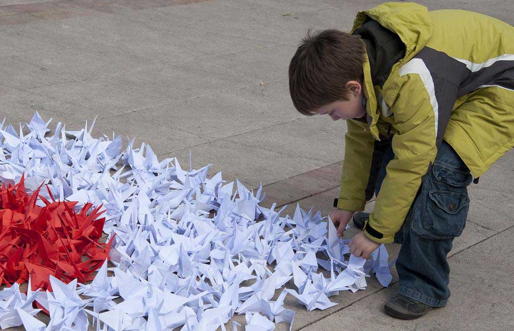 U subotu 19. ožujka smo na glavnom gradskom trgu održali javnu akciju na kojoj su djeca i mladi od petstotinjak bijelih i crvenih origami ždralova formirali japansku zastavu. Ždralovi su nastali kao rezultat intenzivnog trodnevnog rada sa pedesetak djece i ponekim roditeljem, a napravili smo ih u znak suosjećanja i solidarnosti sa ljudima u Japanu suočenima sa prirodnim katastrofama i ekološkom katastrofom koja je upozorenje svim zagovornicima nuklearne energije.